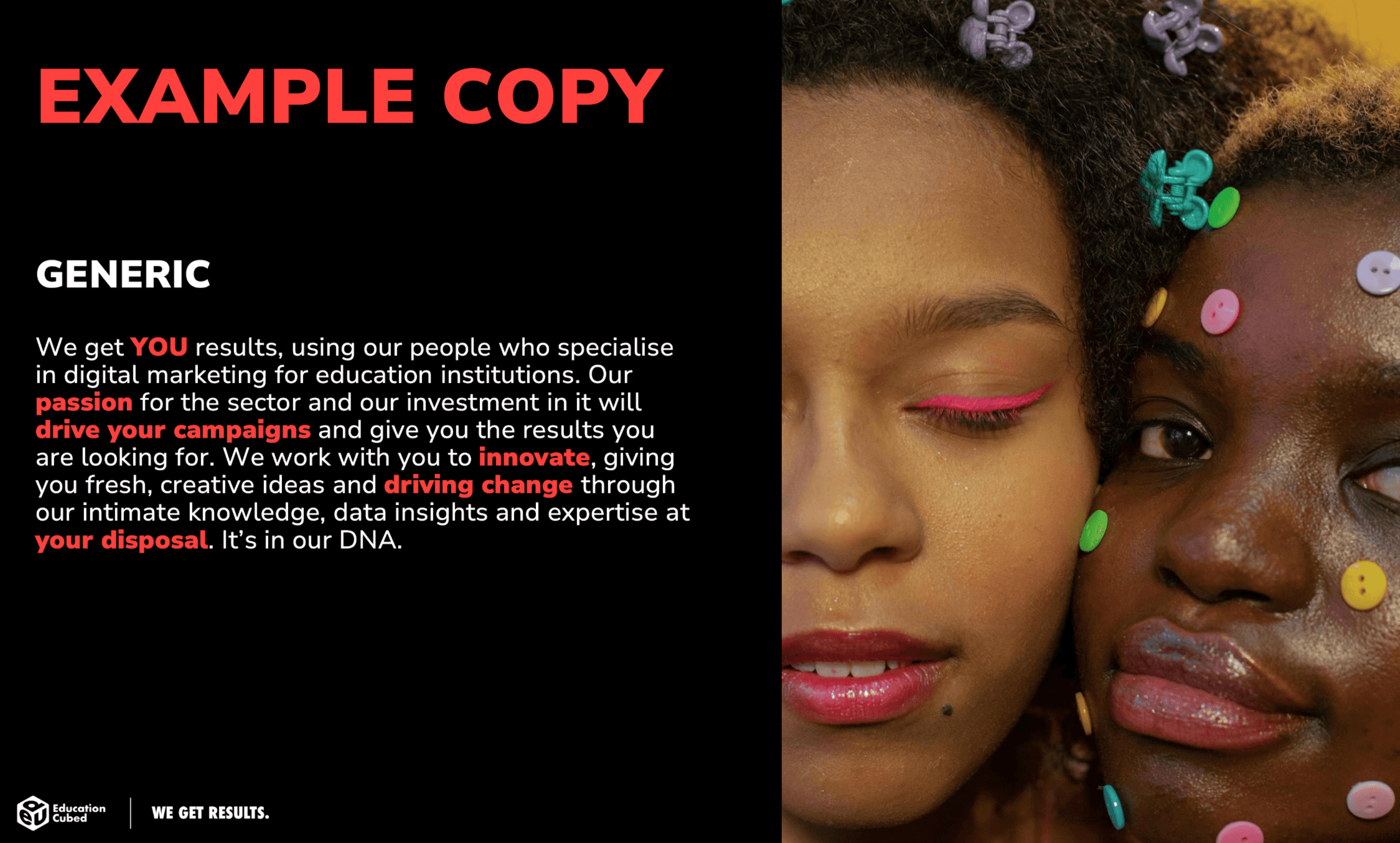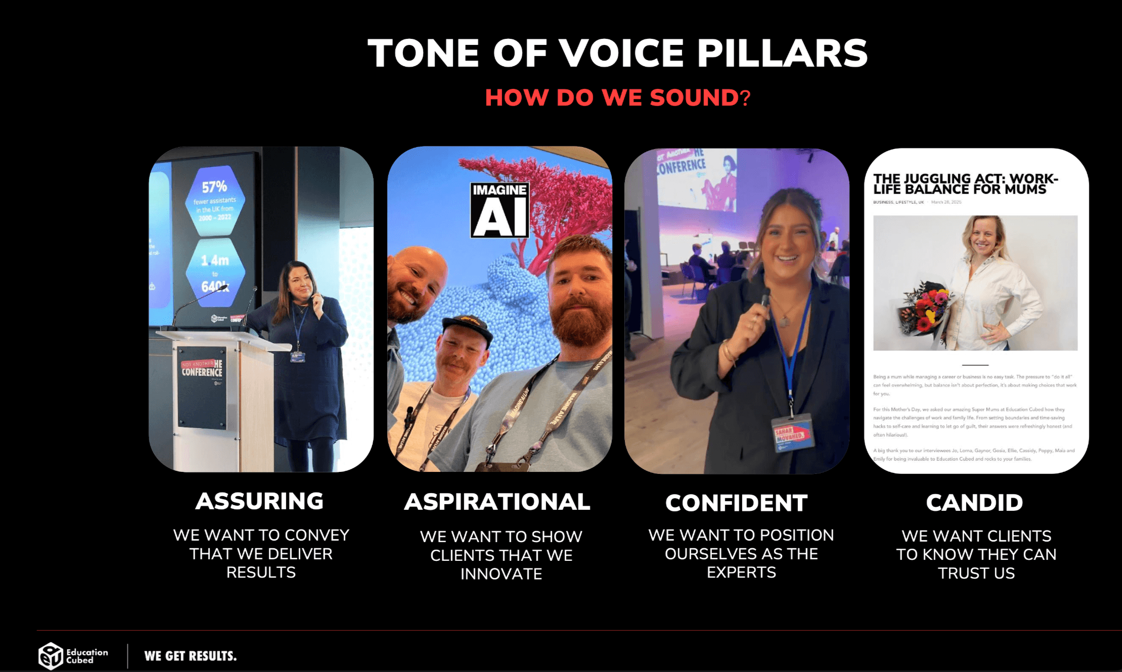 Cohesive messaging across all marketing collateral, and a unique and identifiable tone of voice.